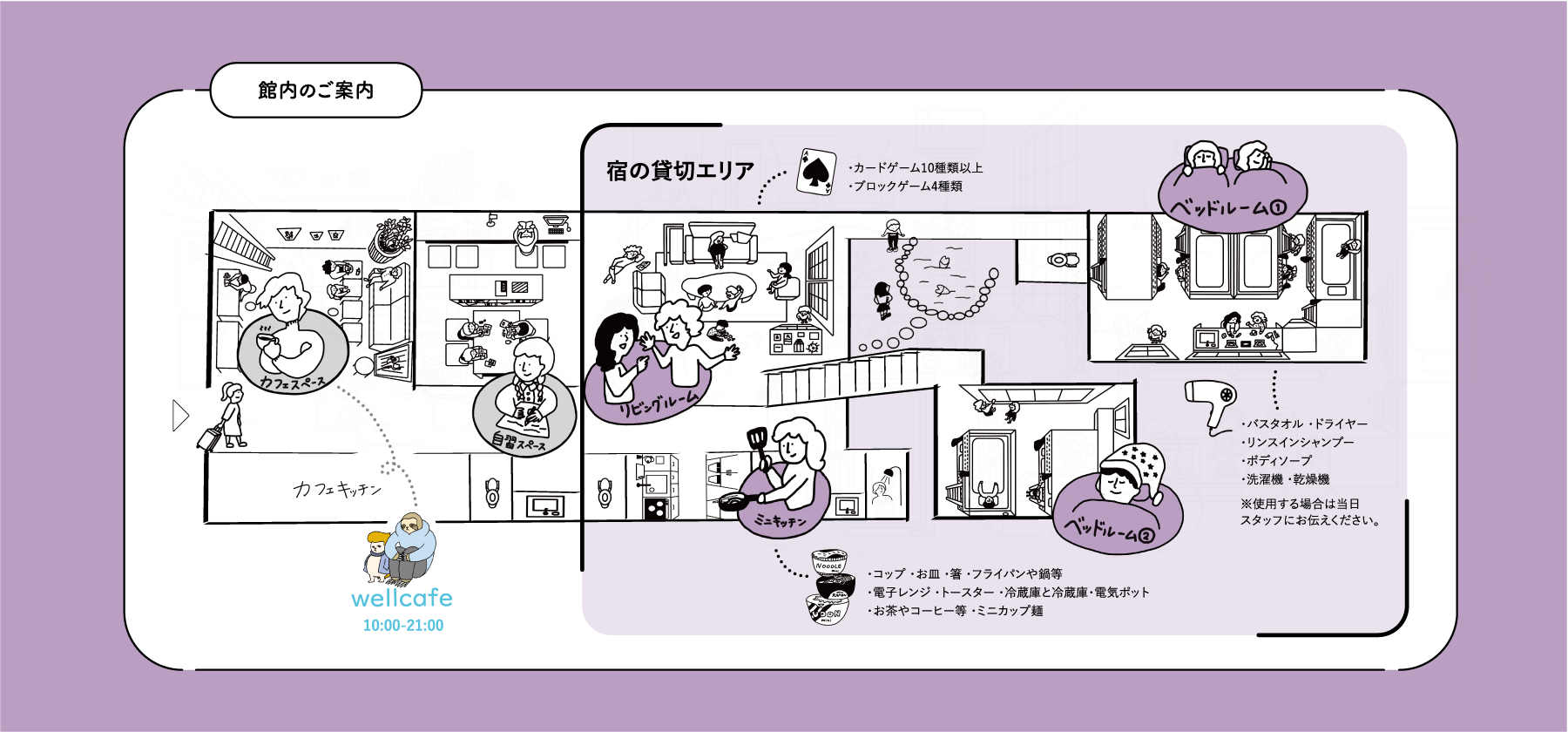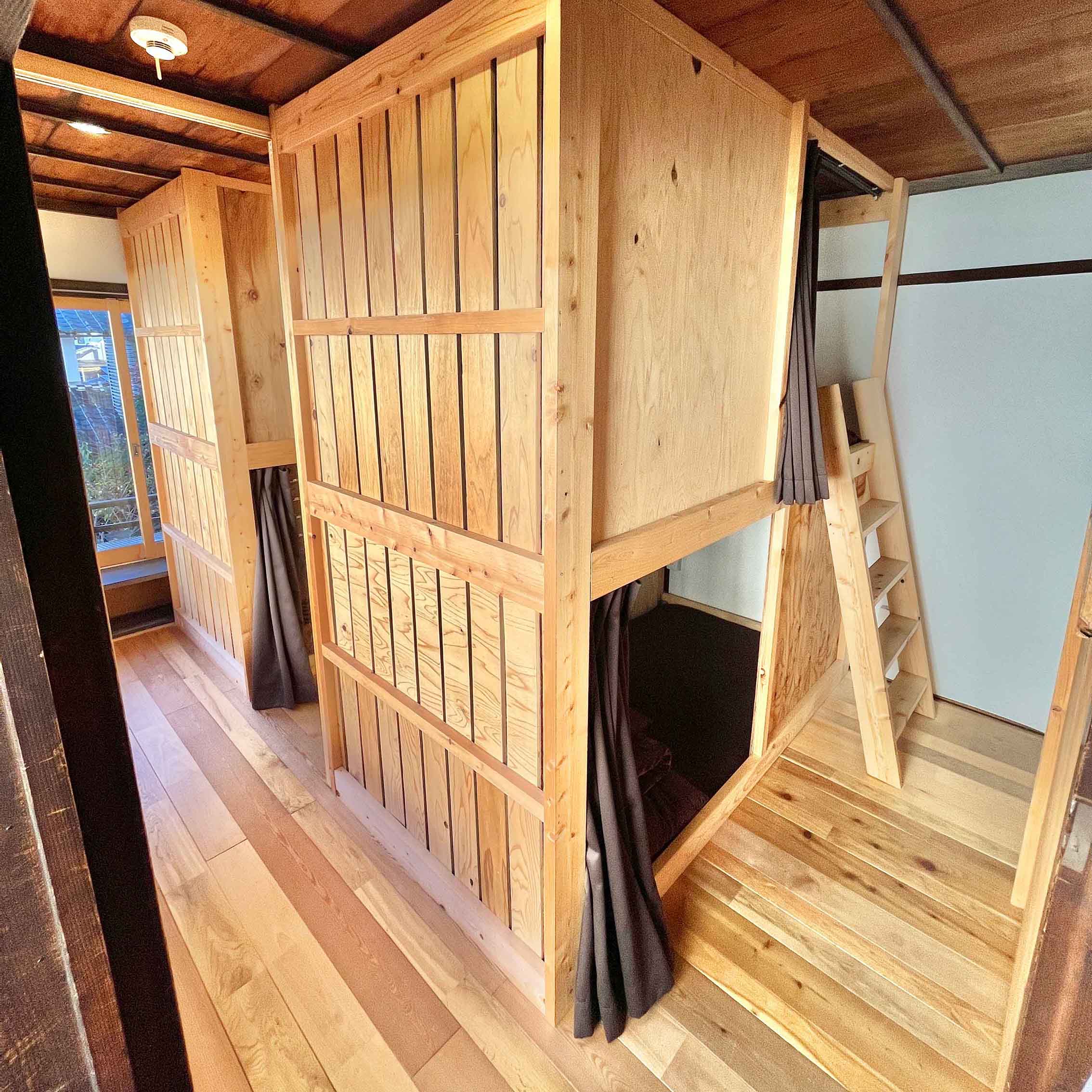 ご宿泊のお客様が、気兼ねなくリビングで楽しそうに会話をしていただけたらと思い、ワイワイできるゲームを各種ご用意させていただいております。寝室は半個室型二段ベッドで秘密基地のようなお子様も喜ぶベッドです。小腹を満たすミニカップ麵やお茶・コーヒーなどのフリードリンクもご用意していますので、宿での時間を皆様でお楽しみください。